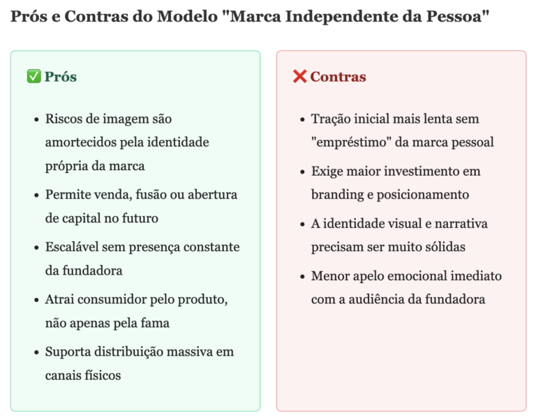 | Potencial de venda futura | Complexo – marca e pessoa são inseparáveis | Alto – a marca pode ser vendida ou capitalizada sem a fundadora |